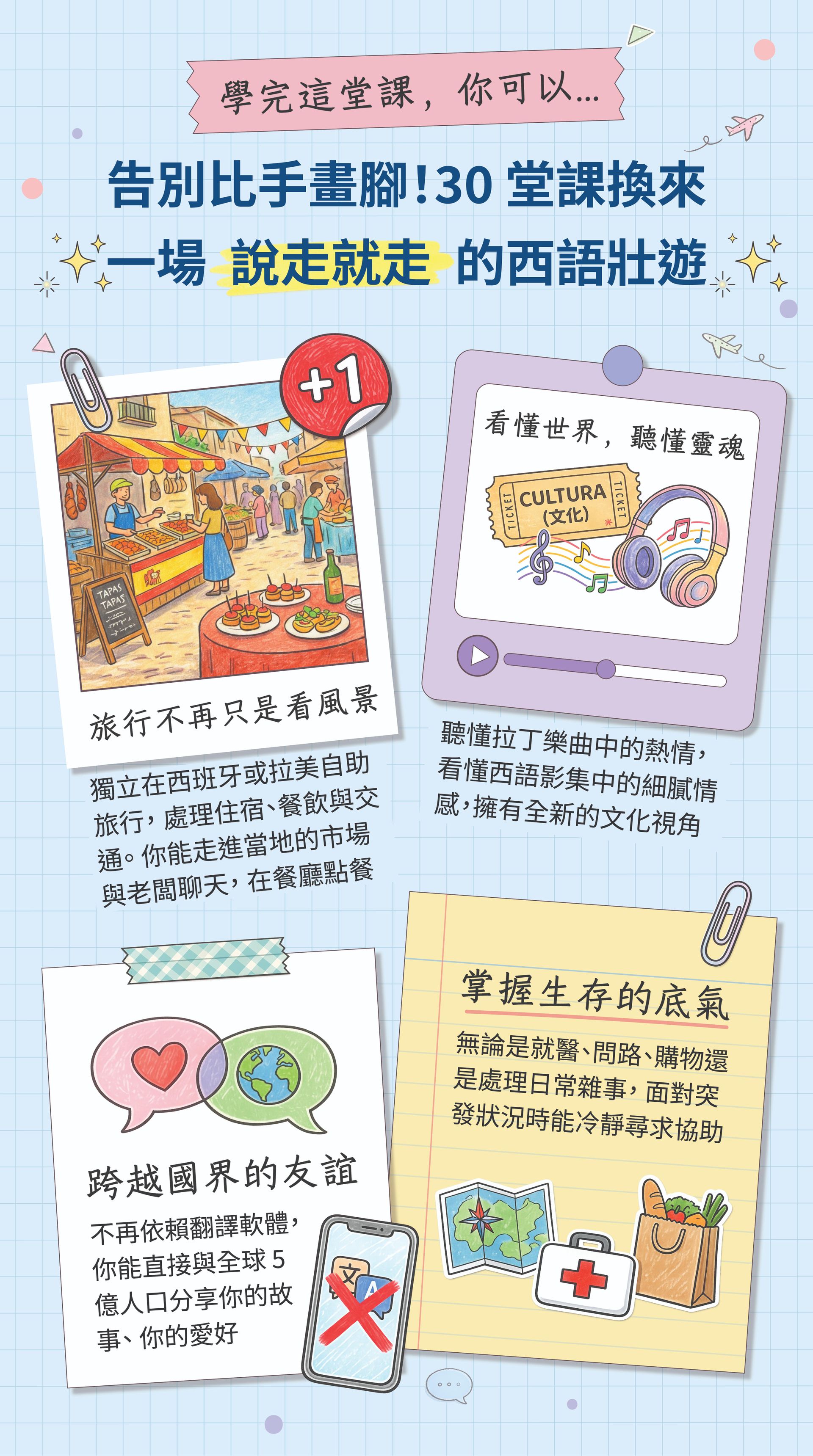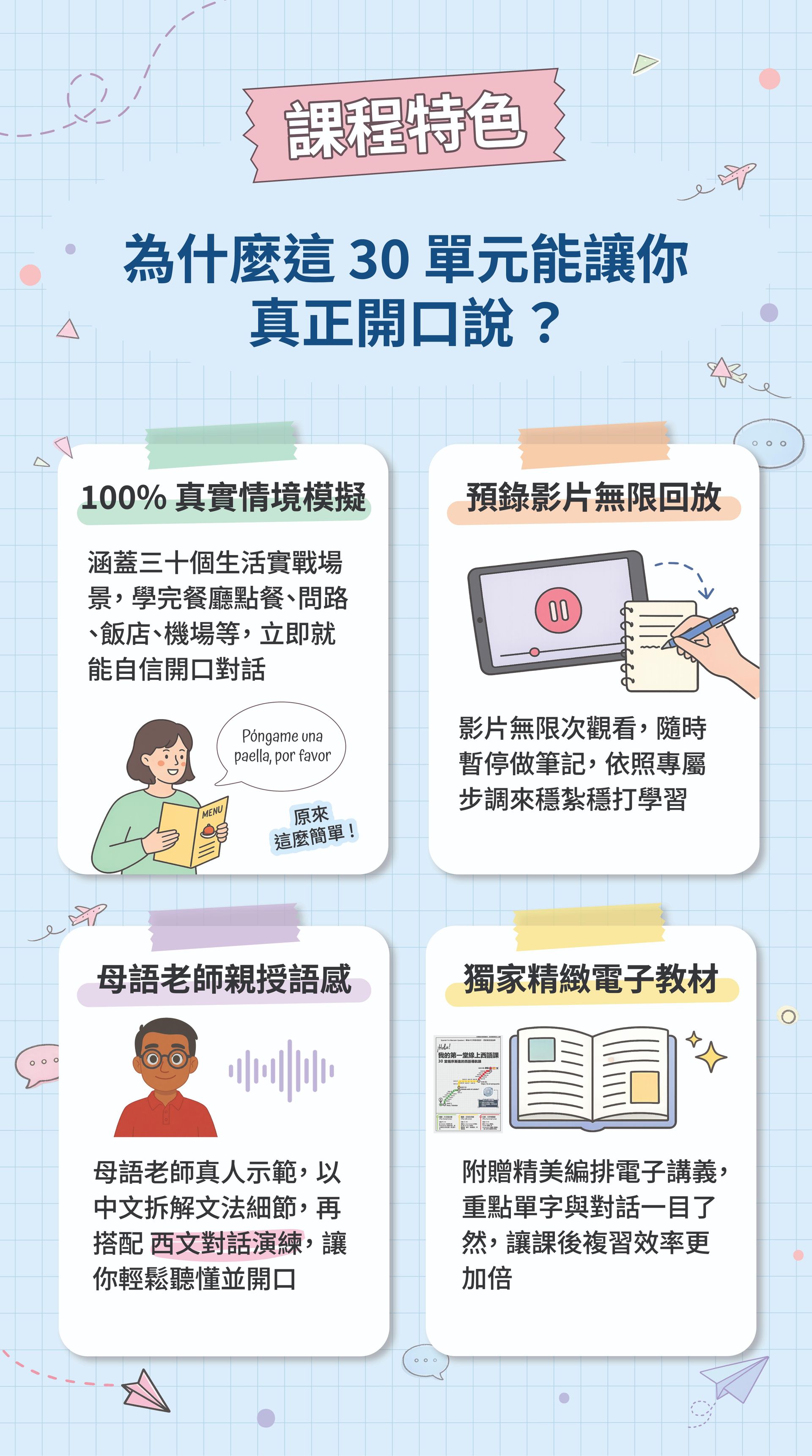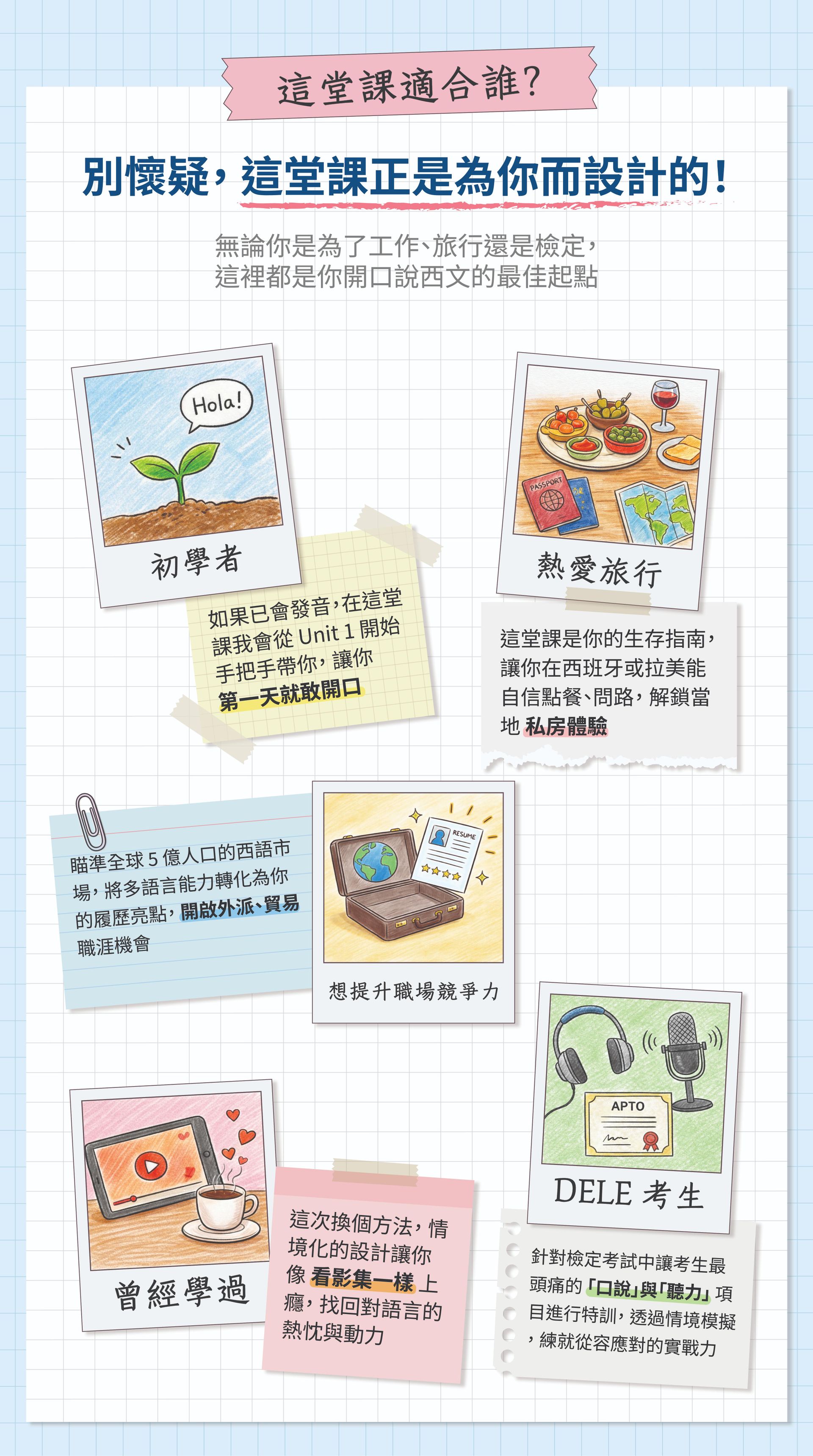 ・專攻初階與中高階會話、DELE 檢定輔導、文法、發音及兒童西語(5歲以上)